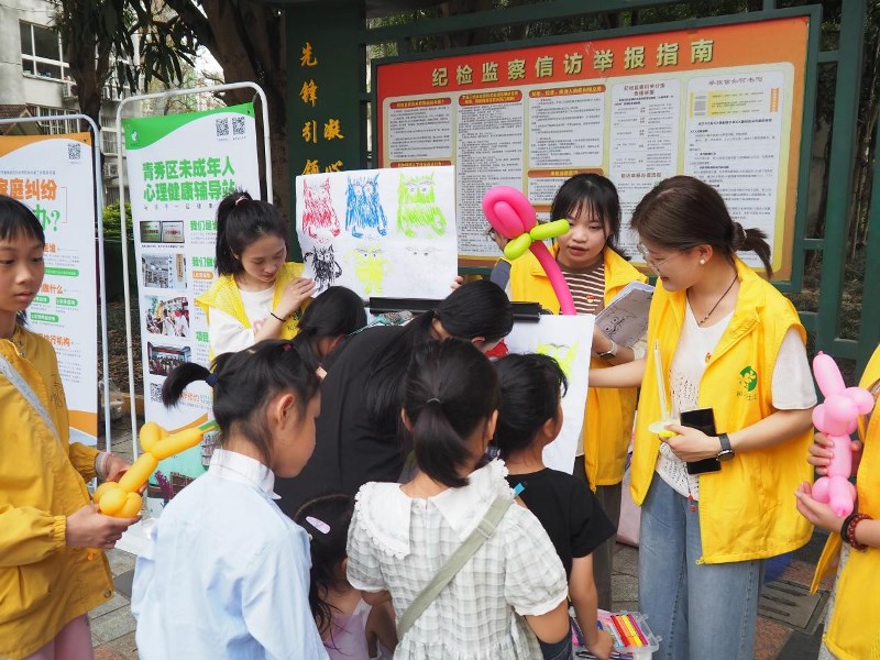 志愿者们分为三组,分别在社区开展性教育转盘游戏、儿童情绪健康涂色游戏和未成年人保护法跳格子问答游戏,发放宣传册的同时现场制作魔法气球作为互动奖品。青年志愿者用通俗易懂的方式为孩子们介绍未成年人保护法、反家庭暴力法、义务教育法等重要法律内容,引导孩子们学会表达情绪和转变思维,并给孩子们及其家长科普性教育的重要性。